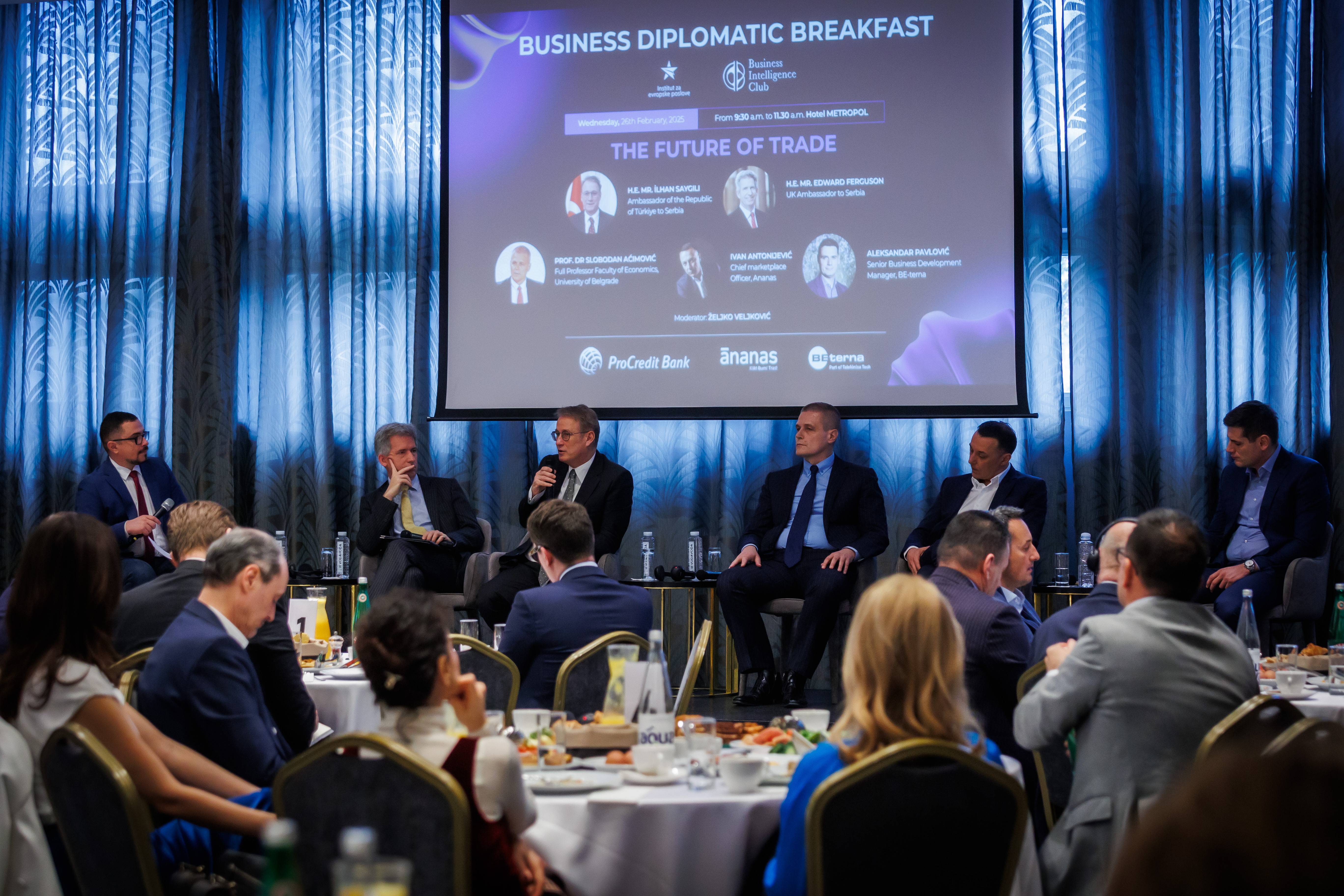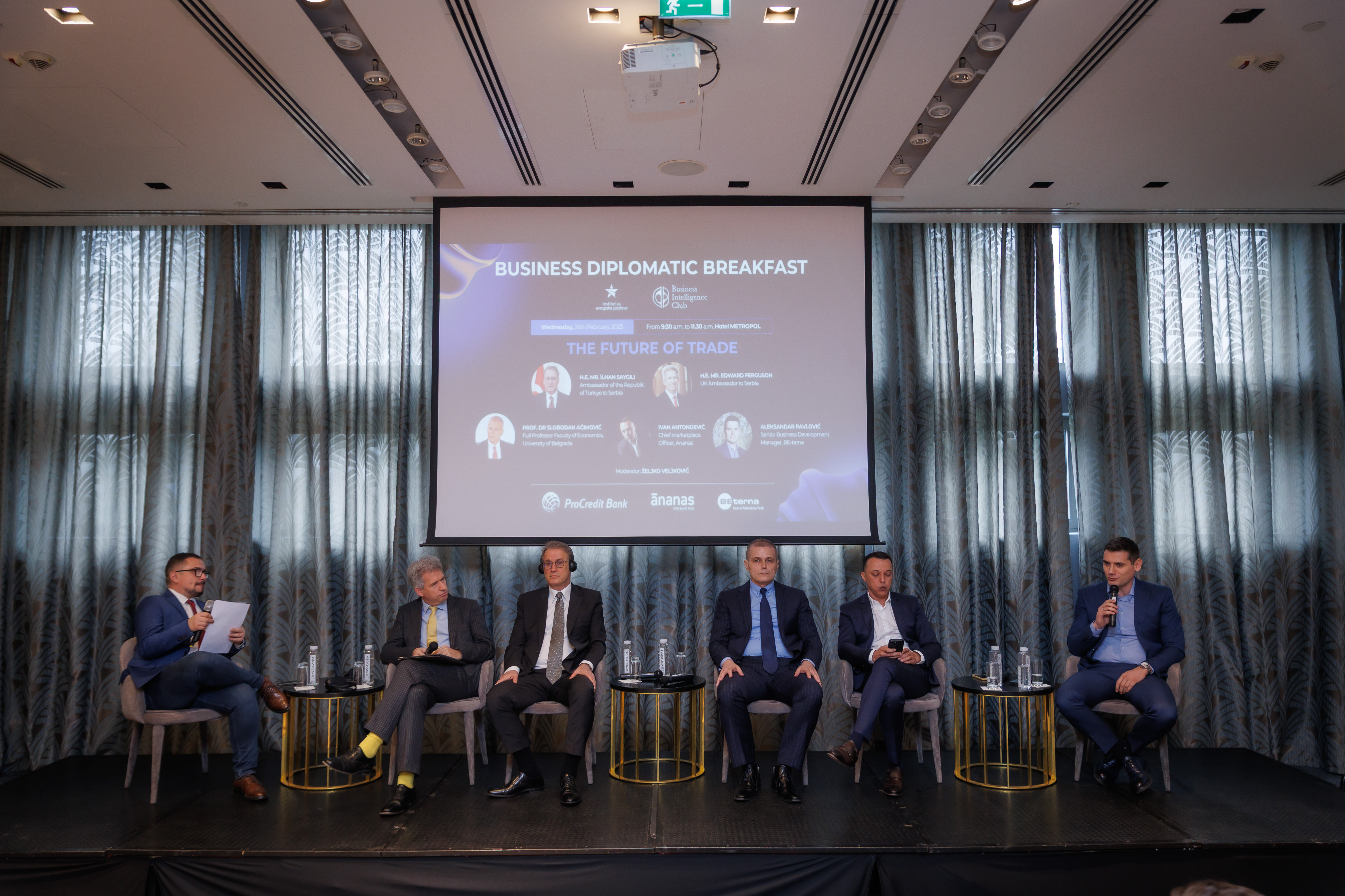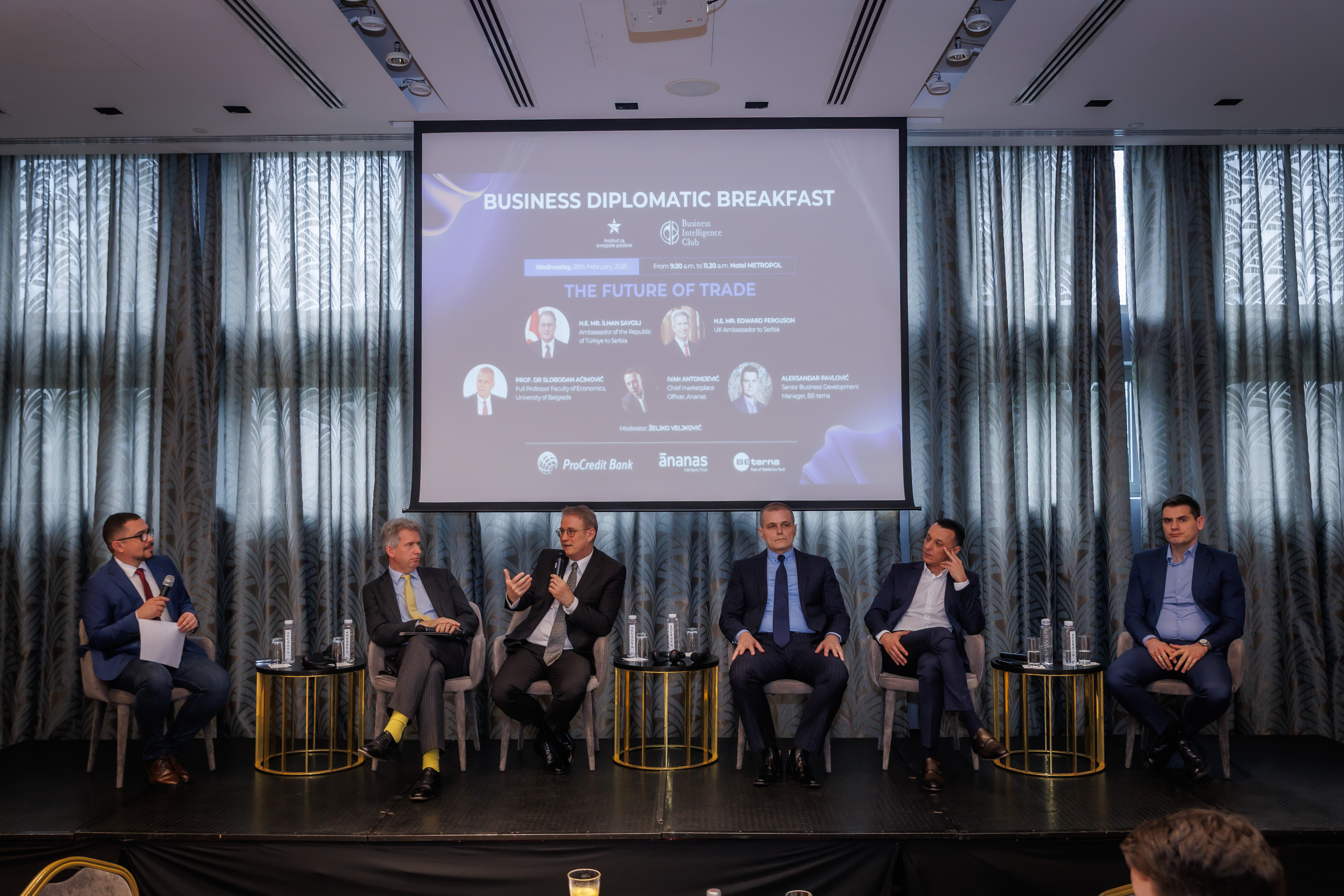 Naši uvaženi panelisti su bili NJ.E. Ilhan Sajgili, ambasador Republike Turske u Srbiji, Nj.E. Edvard Ferguson, ambasador Ujedinjenog Kraljevstva u Srbiji, Prof. dr Slobodan Aćimović, redovan profesor Ekonomskog fakulteta, Ivan Antonijević, Chief Marketplace Officer kompanije Ananas i Aleksandar Pavlović, Senior Business Development Manager kompanije BE-terna. Ovim interesantnim poslovnim panelom moderirao je Željko Veljković, novinar.